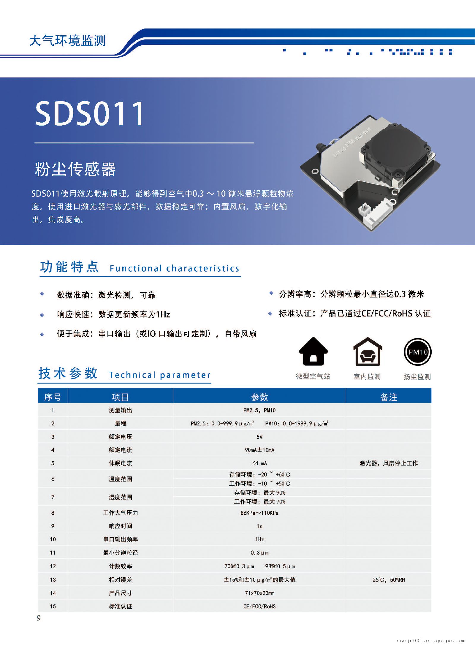 SDS011使用激光散射原理,能够得到空气中0.3 ~ 10 微米悬浮颗粒物浓度,使用进口激光器与感光部件,数据稳定可靠;内置风扇,数字化输出,集成度高。
