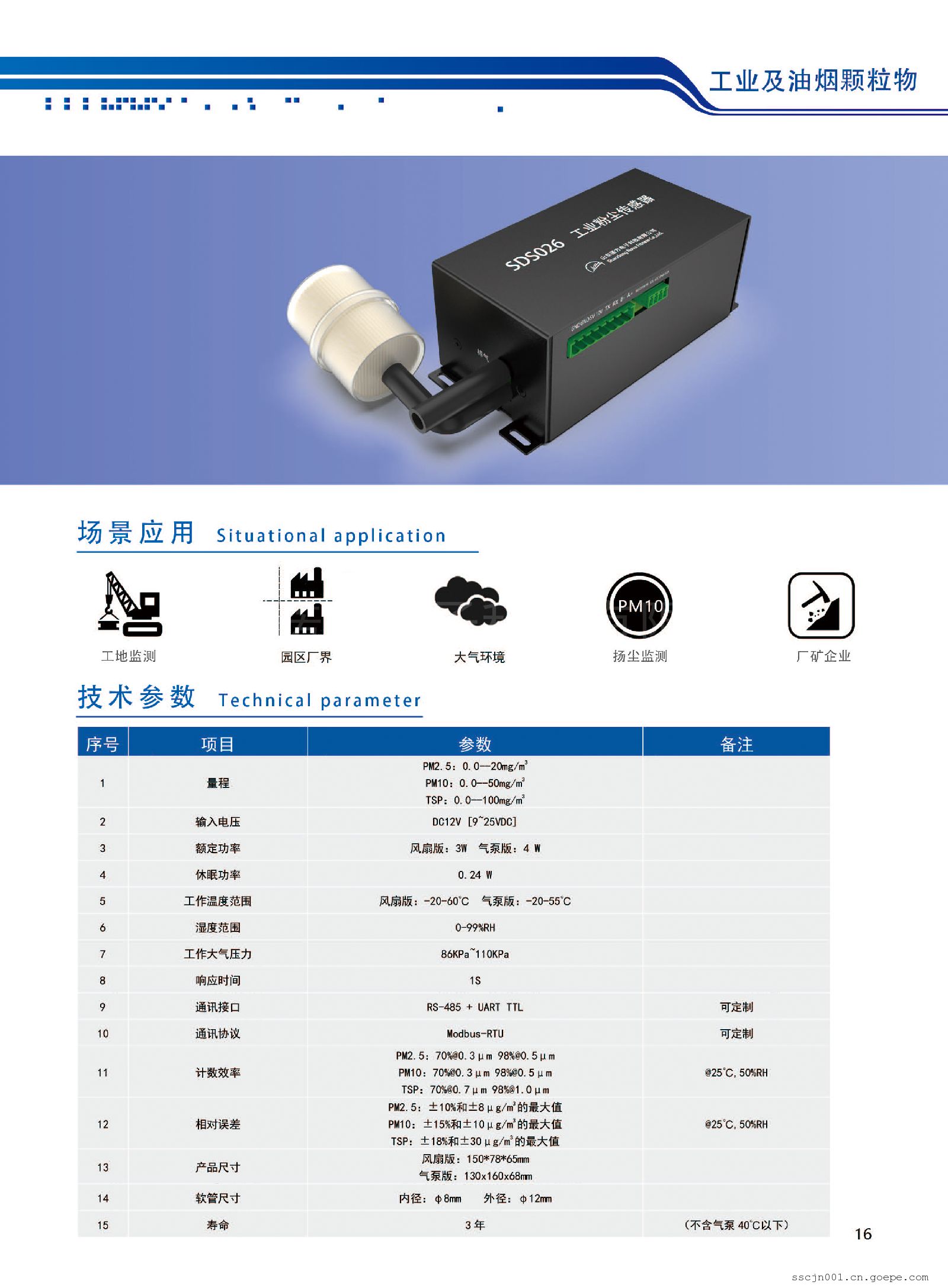 SDS026是一款基于激光散射法原理的高量程工业环境颗粒物传感器,支持外接温湿度探头(选配),可对数据进行自动湿度校准;工业级激光器与感光部件,同时光学元件部位增加鞘气保护结构,大大提高恶劣环境下传感器使用寿命,大大减轻了维护工作量,传感器适用于工地扬尘、道路扬尘、环保的在线粉尘浓度检测。特点