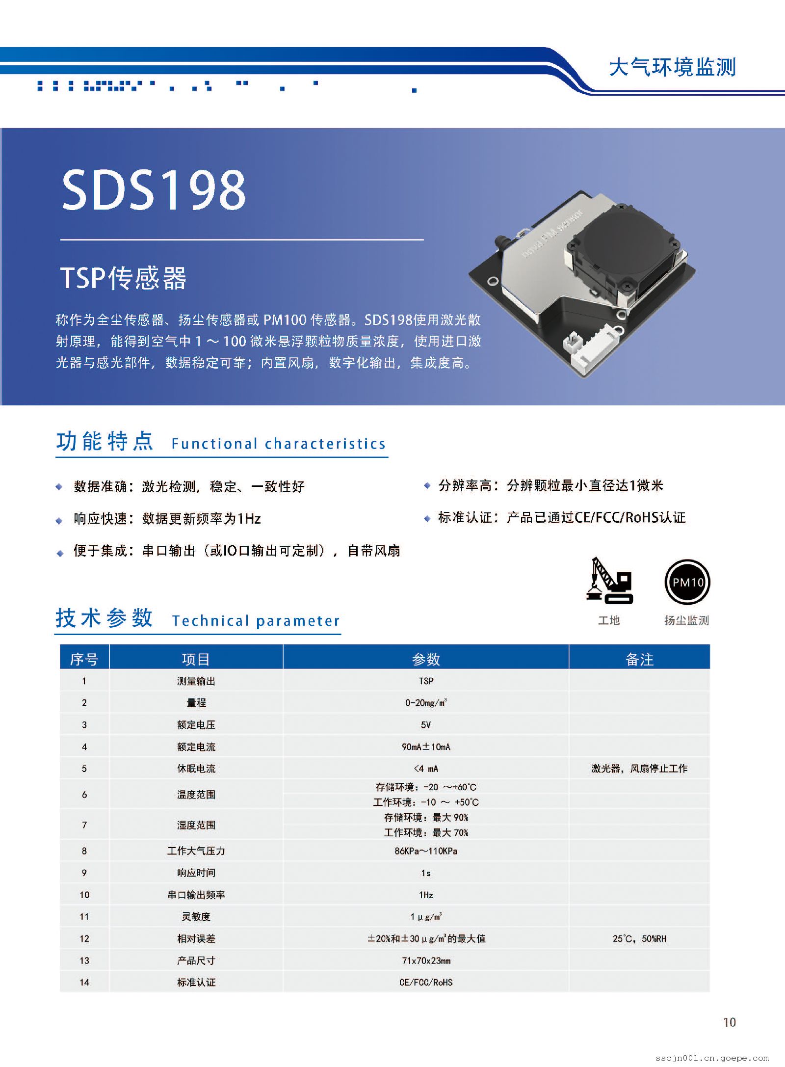 PM100传感器,又称作为全尘传感器、扬尘传感器或TSP传感器。SDS198使用激光散射原理,能得到空气中1~100微米悬浮颗粒物质量浓度,使用进口激光器与感光部件,数据稳定可靠;内置风扇,数字化输出,集成度高。由于风力风向等因素影响,很多情况下TSP浓度空间分布并不均匀,如工地、道路、石子加工厂等,此时更适合用SDS198进行多布点测试。